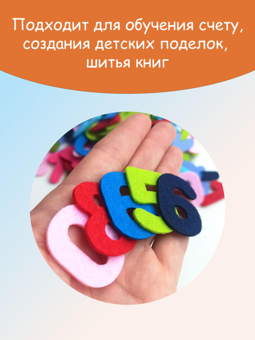 У цифр аккуратные края, не мохрятся, не царапают нежную детскую кожу. Материал (полиэстр) можно стирать в стиральной машине. В комплекте 5 оттенков (цифры от 1 до 10 каждого цвета), выбор оттенков случайный: красный, синий, зеленый, желтый, розовый, оранжевый, голубой, сиреневый, салатовый и др.