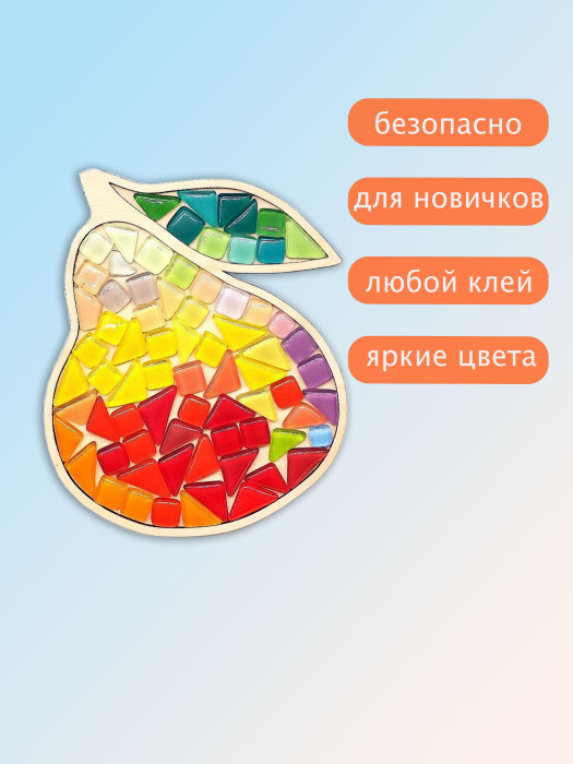 Материал для декора представлен в ярком миксе из более 15 радужных цветов, что позволяет создавать красочные композиции. Стеклянная мозаика легко клеится на густые клеи и клей ПВА и подходит для нанесения на различные поверхности: дерево, картон, пластик, стекло, керамика и другие.